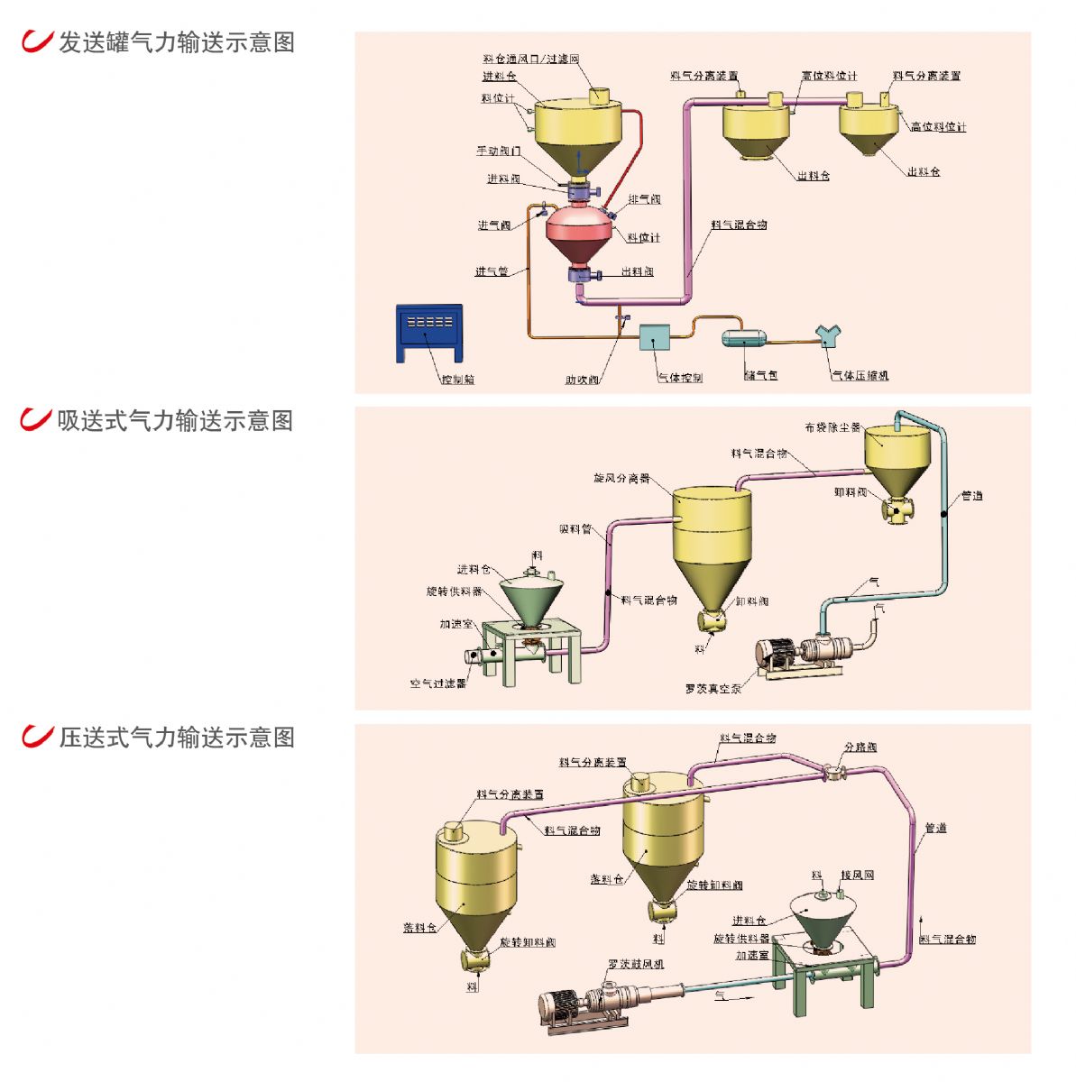 正壓和負(fù)壓也可進(jìn)行組合應(yīng)用以滿足特殊要求,比較適用于多點(diǎn)供料單點(diǎn)出料的輸送方式,通常為輸送粉狀、小顆粒或比重較輕的物料。